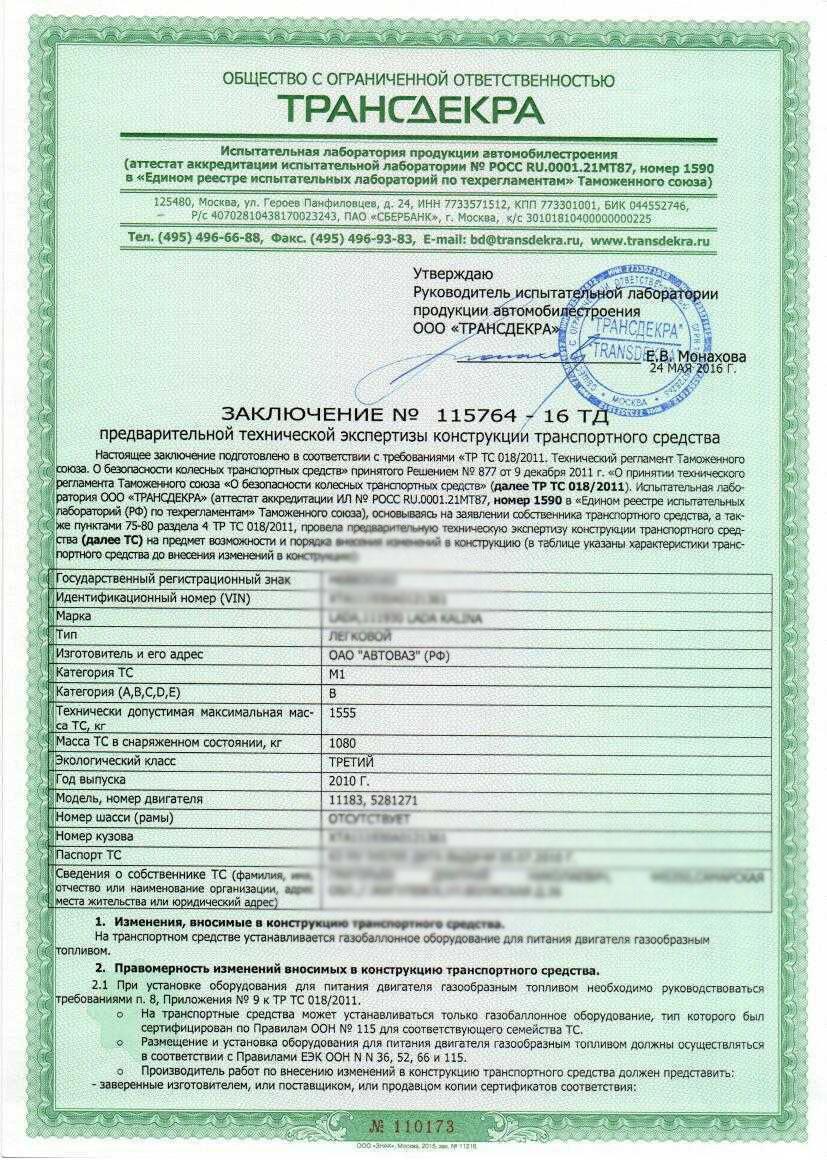 Протокол технической экспертизы. Документ, выдаваемый испытательной лабораторией, в котором указаны следующие данные: вид изменений, внесенных в конструкцию автомобиля; отметка о выполнении требований организацией, которая производила монтаж; отметка о выполнении требований о соответствии элементов газобаллонной системы и газового баллона; заключение о соответствии технического состояния транспортного средства требованиям безопасности, прописанным в ТР ТС 018/2011.
