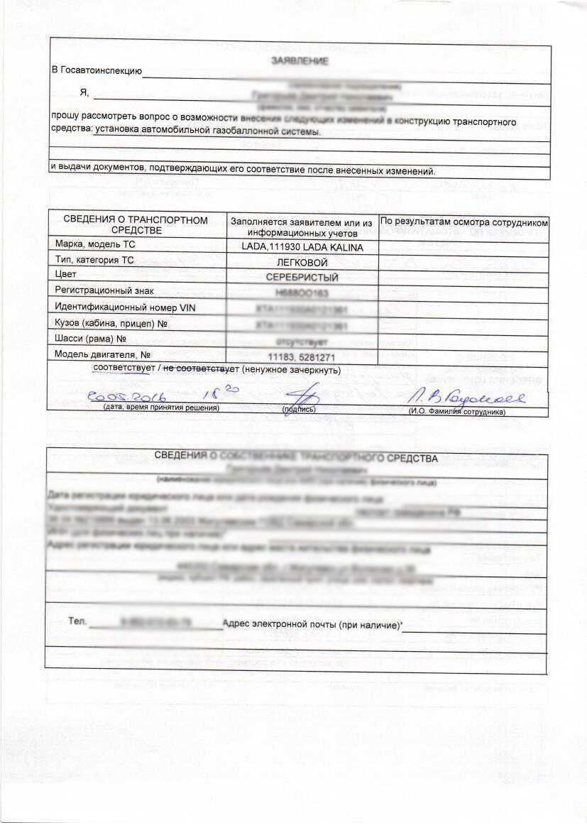 Заявление в ГИБДД (юридическое разрешение). Данный документ подтверждает возможность установки ГБО с юридической точки зрения - отсутствие штрафов, обременений и пр. Он проверяется инспектором.