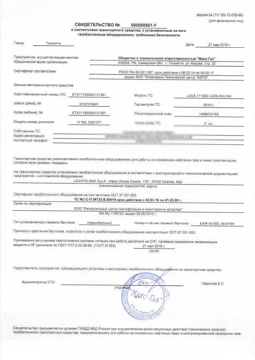 Свидетельство формы 2а. Документ, который подтверждает факт переоборудования ТС конкретной организацией, с указанием производителя и модели установленной газовой системы.